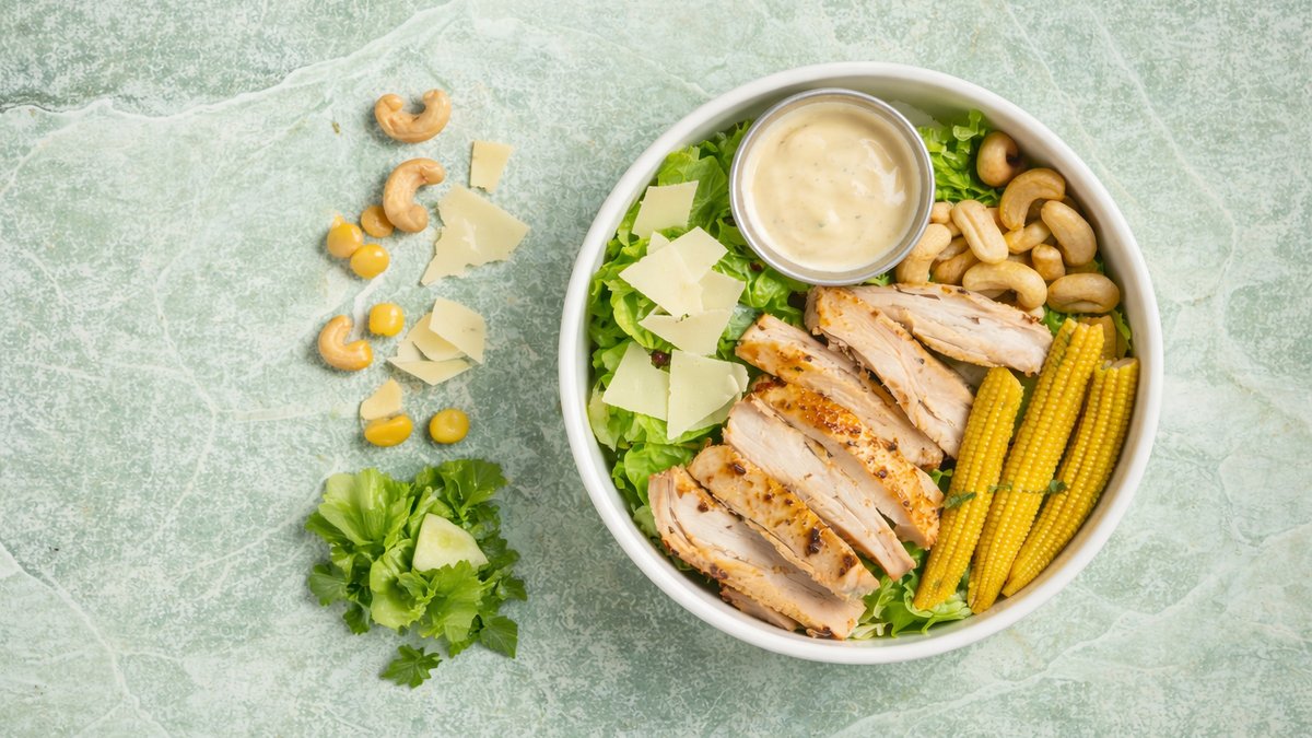 Παναρισμένο φιλέτο κοτόπουλο ψημένο στο φούρνο, iceberg, παρμεζάνα, καλαμπόκι baby, caesar's sause. 440kcal, πρωτεΐνη 32g, υδατάνθρακας 50g, λιπαρά 18g.