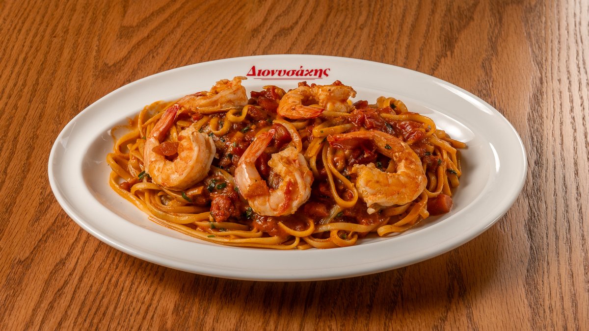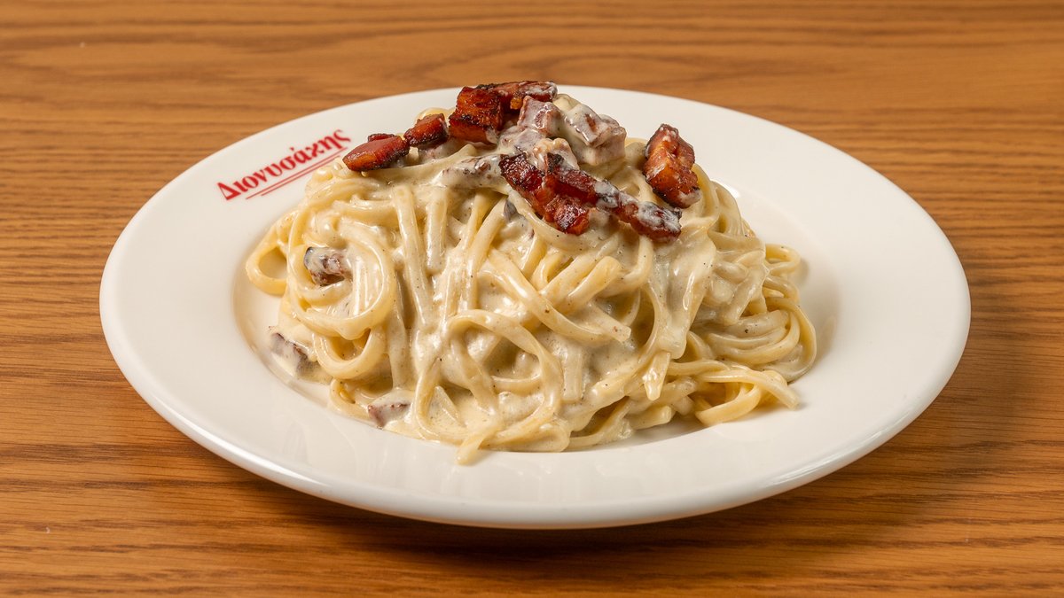 Λιγκουίνι με τραγανή πανσέτα, σάλτσα ντομάτας, λαδοτύρι Ζακύνθου και πεκόρινο