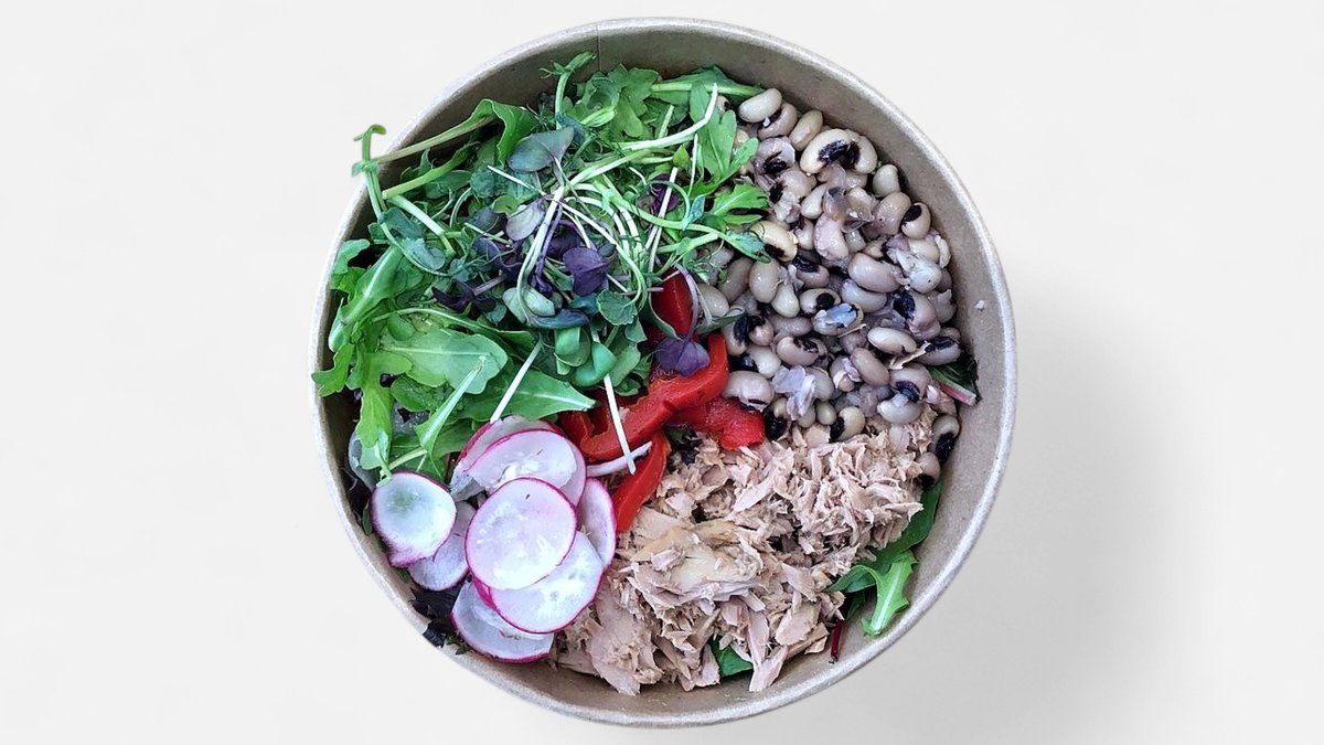 Σαλατα, τόνος, φακες(αντι μαυροματικα φασολια), ρόκα, τοματίινια, ραπανάκι,πιπεριά φλωρίνης, micro greens. Θερμιδες 220kcal