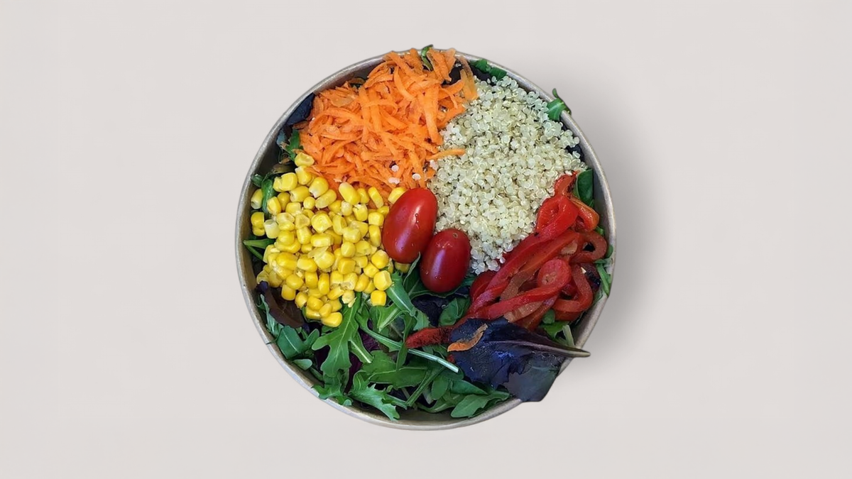 Bio σαλάτα, quinoa, καλαμπόκι, καρότο,πιπεριές, τοματίνια, συνοδεύεται απο σωσάκι.επιλογήη πρωτεΐνης.