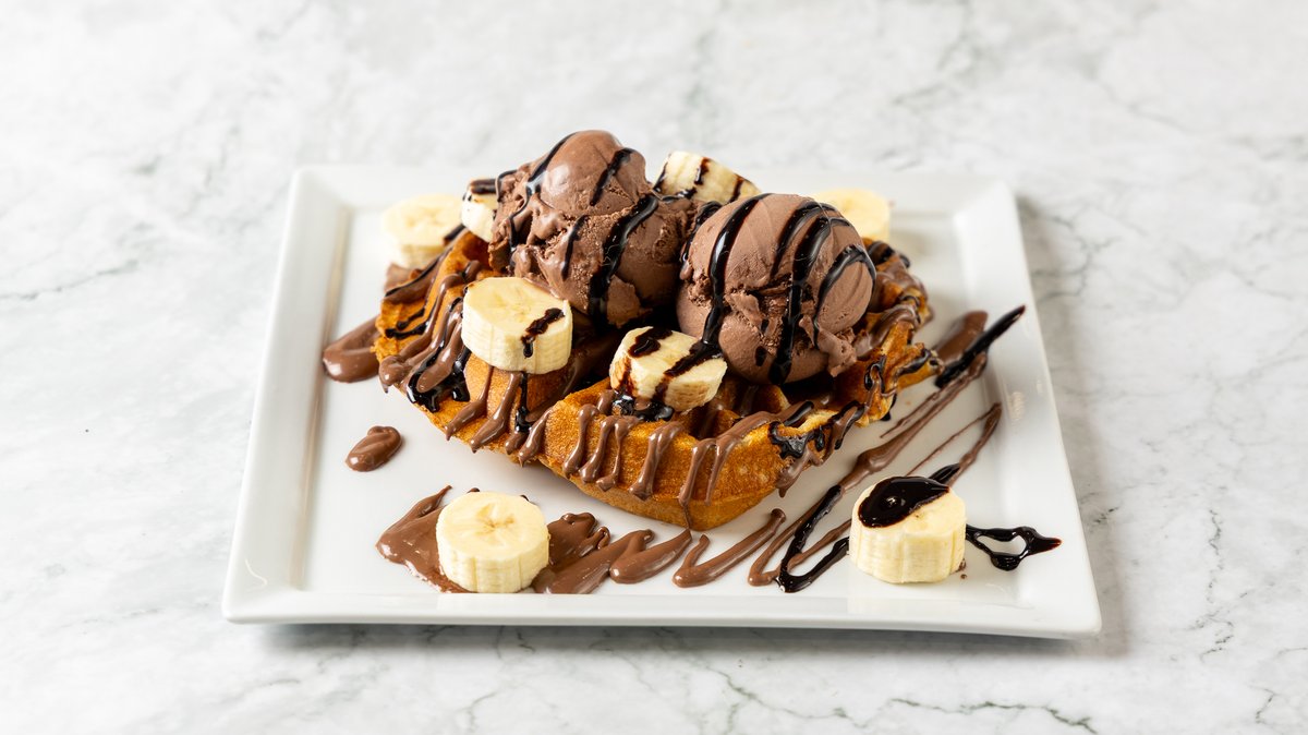 Βάφλα με πραλίνα, 2 μπάλες παγωτό με γεύση Merenda , φρέσκια μπανάνα και σιρόπι σοκολάτας