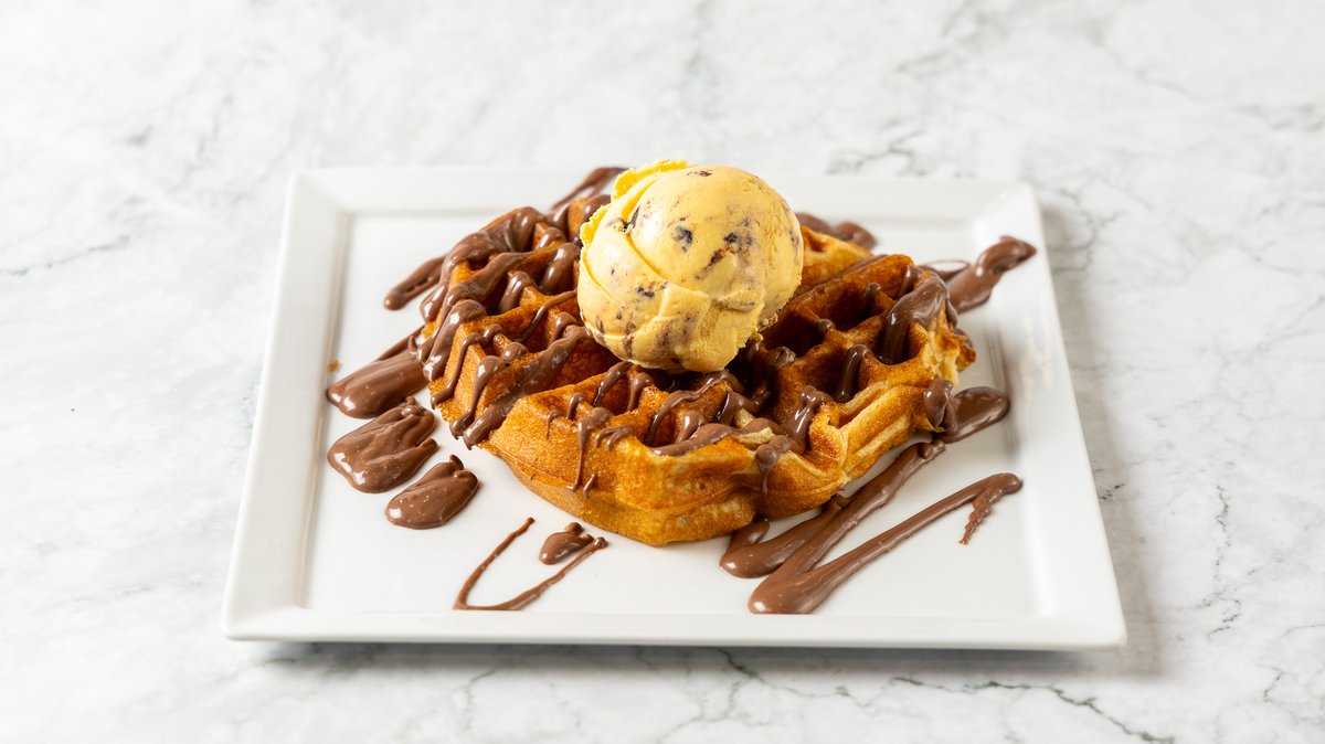 Βάφλα με πραλίνα, 3 μπάλες παγωτό Σοκολάτα με κομμάτια σοκολάτας, cream and cookies, cookie και crunch με σως ζεστής σοκολάτας υγείας