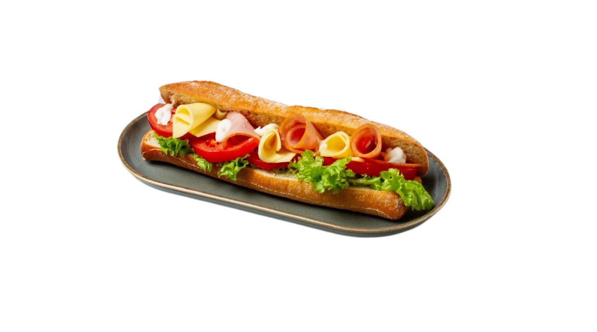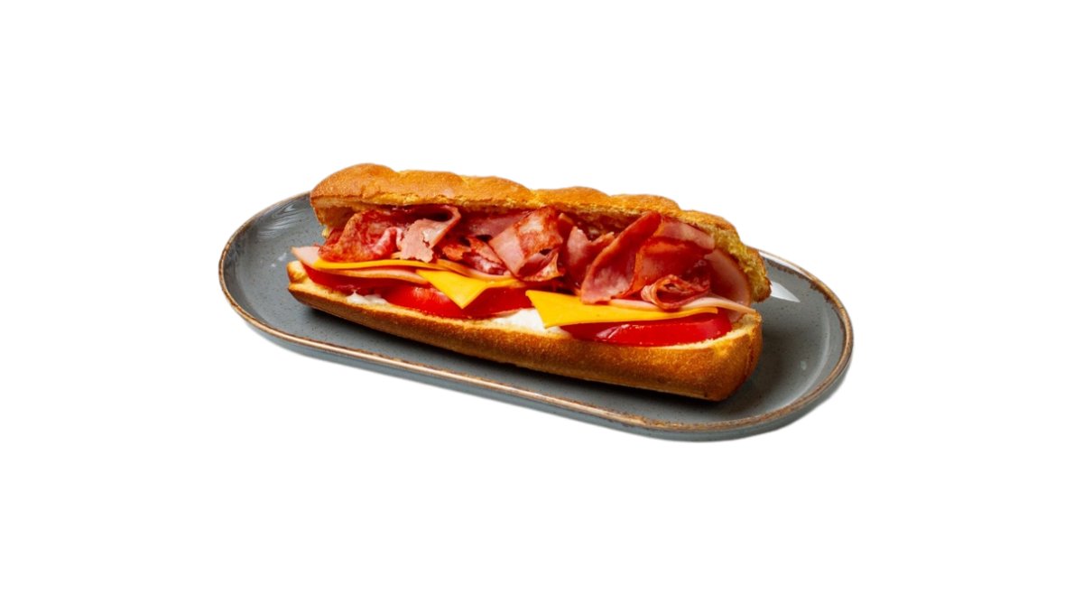 Φρεσκοψημένη λευκή μπαγκέτα άτου με καπνιστή γαλοπούλα & ζαμπόν, σαλάμι αέρος, μπέικον, cheddar, τομάτα, μαγιονέζα