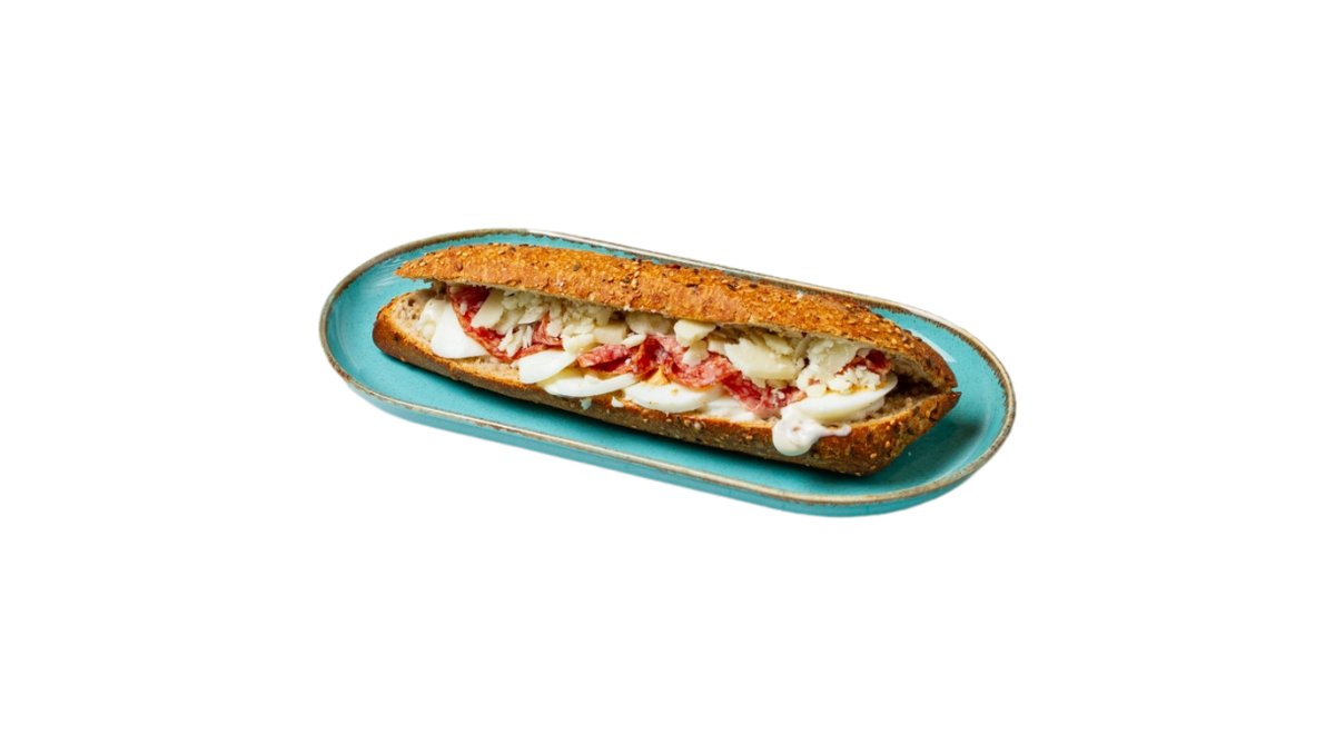 Φρεσκοψημένη λευκή μπαγκέτα άτου με σαλάμι αέρος, τομάτα, τυρί, μαγιονέζα