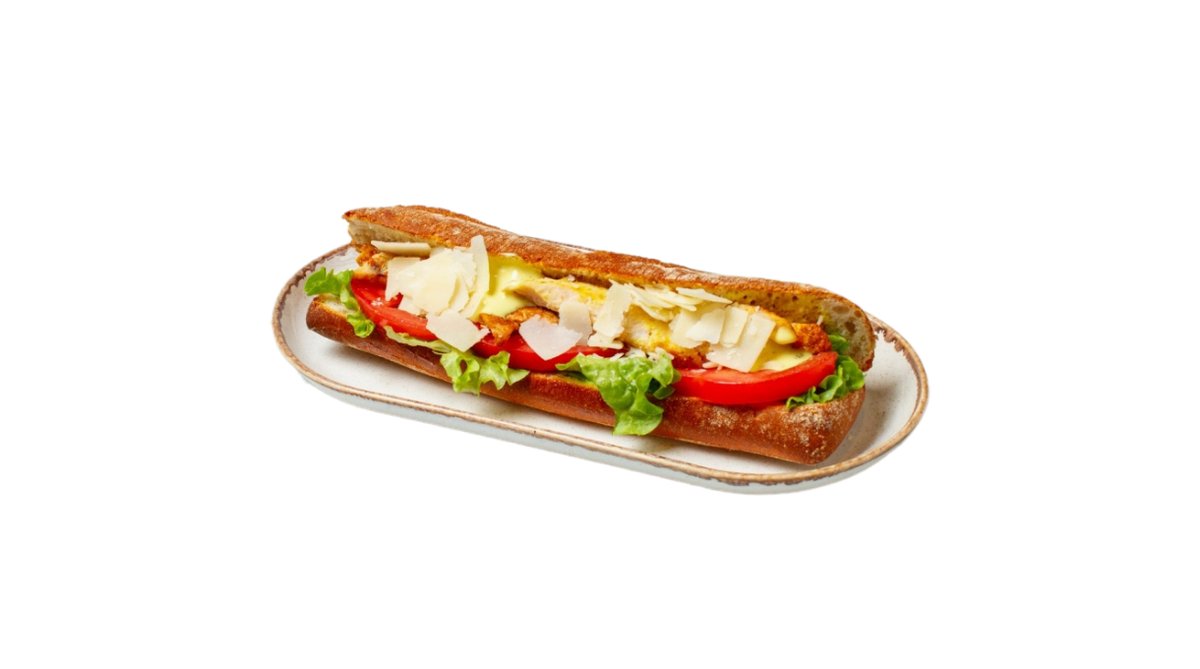 Φρεσκοψημένη λευκή μπαγκέτα άτου με κοτόπουλο φιλέτο, παρμεζάνα, ρόδελα τομάτας, λόλα, caesar's sauce