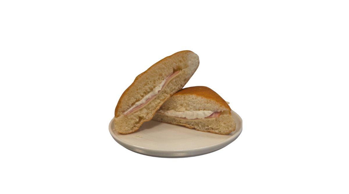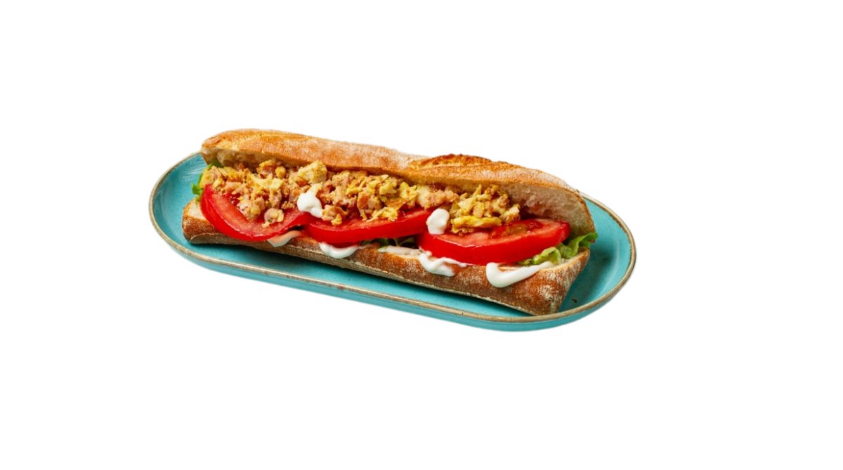 Φρεσκοψημένη λευκή μπαγκέτα σίτου με καπνιστό χοιρινό, gouda, ροδέλα ντομάτας, λόλα και μαγιονέζα