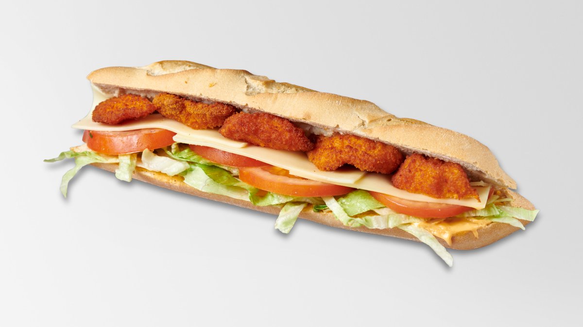 Λευκή μπαγκέτα με κοτόπουλο πανέ, ντομάτα, caesar's, μπέικον, παρμεζάνα και λόλα