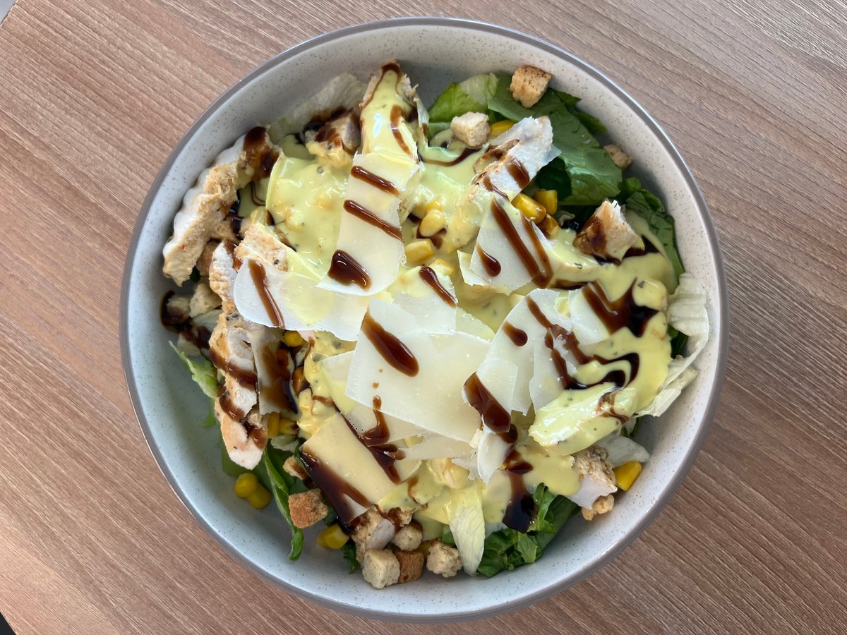 Με μαρούλι, ice berg, κρουτόν, καλαμπόκι, κοτόπουλο, παρμεζάνα, κρέμα μπαλσάμικο και σως caesar's
