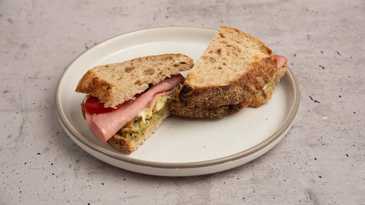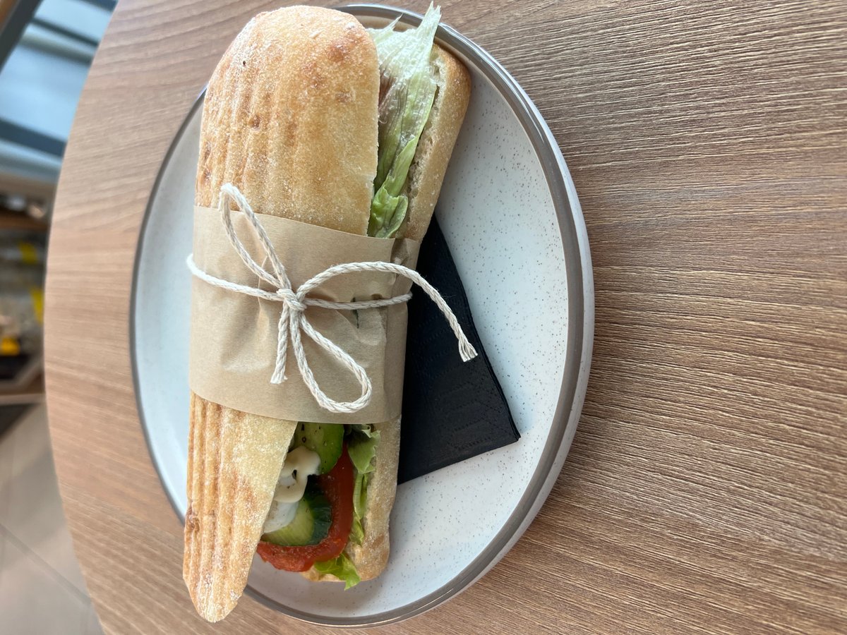 Με ψωμάκι τσιαπάτα, αβοκάντο, αυγό βραστό, τυρί κρέμα, ice berg, ντομάτα και αγγούρι