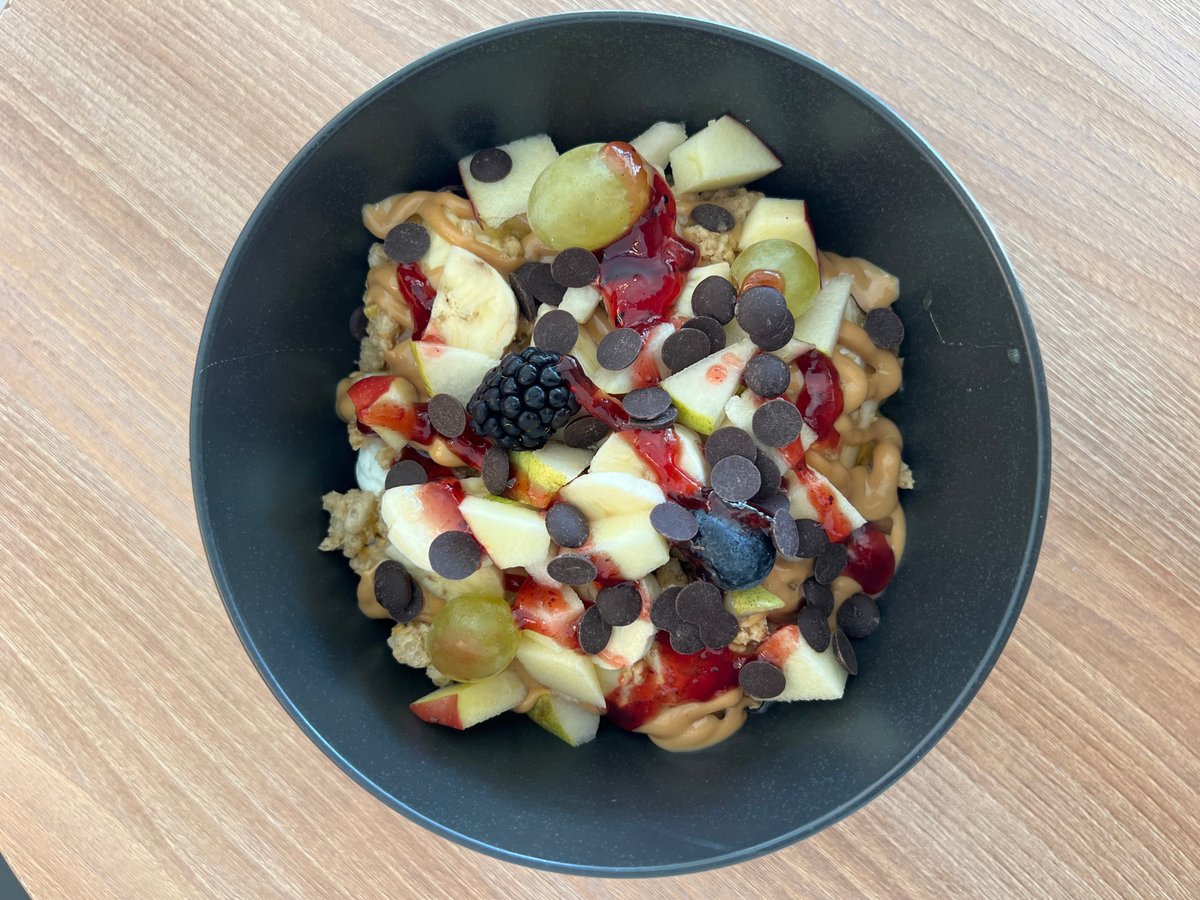 Με φρούτα εποχής, γκρανόλα, φυστικοβούρτυρο, μαρμελάδα φρούτα του δάσους, σταγόνες σοκολάτας και μέλι