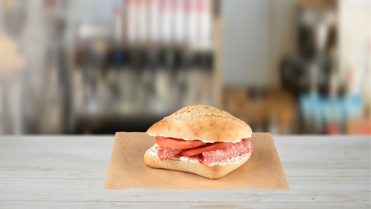 Χειροποίητο ψωμάκι demice με σαλάμι αέρος, edam, pesto βασιλικού, ντομάτα και μαγιονέζα