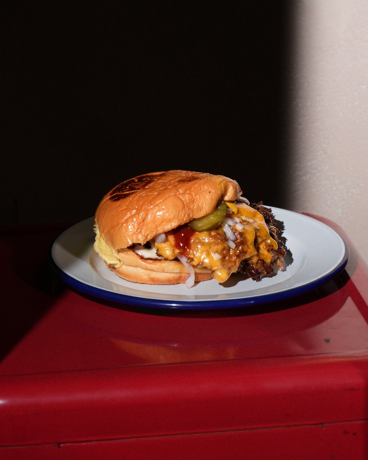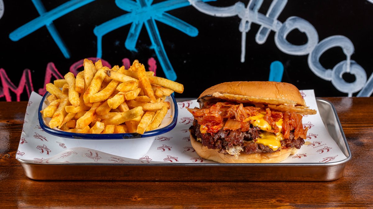 Με 2 smashed dry aged μοσχαρίσια μπιφτέκια, διπλό American cheese, κρεμμύδι, ψιλοκομμένο iceberg, μαρμελάδα μπέικον και μαγιονέζα καμένου σκόρδου. Συνοδεύεται από πατάτες τηγανητές