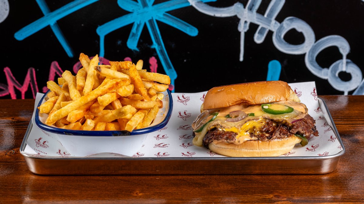Martin’s famous potato bun, 2 smashed dry aged μπιφτέκια μοσχαρίσια, διπλό American cheese, baconnaise, πιπεριές jalapenos, ψημένα κρεμμύδια. Συνοδεύεται από πατάτες τηγανητές.