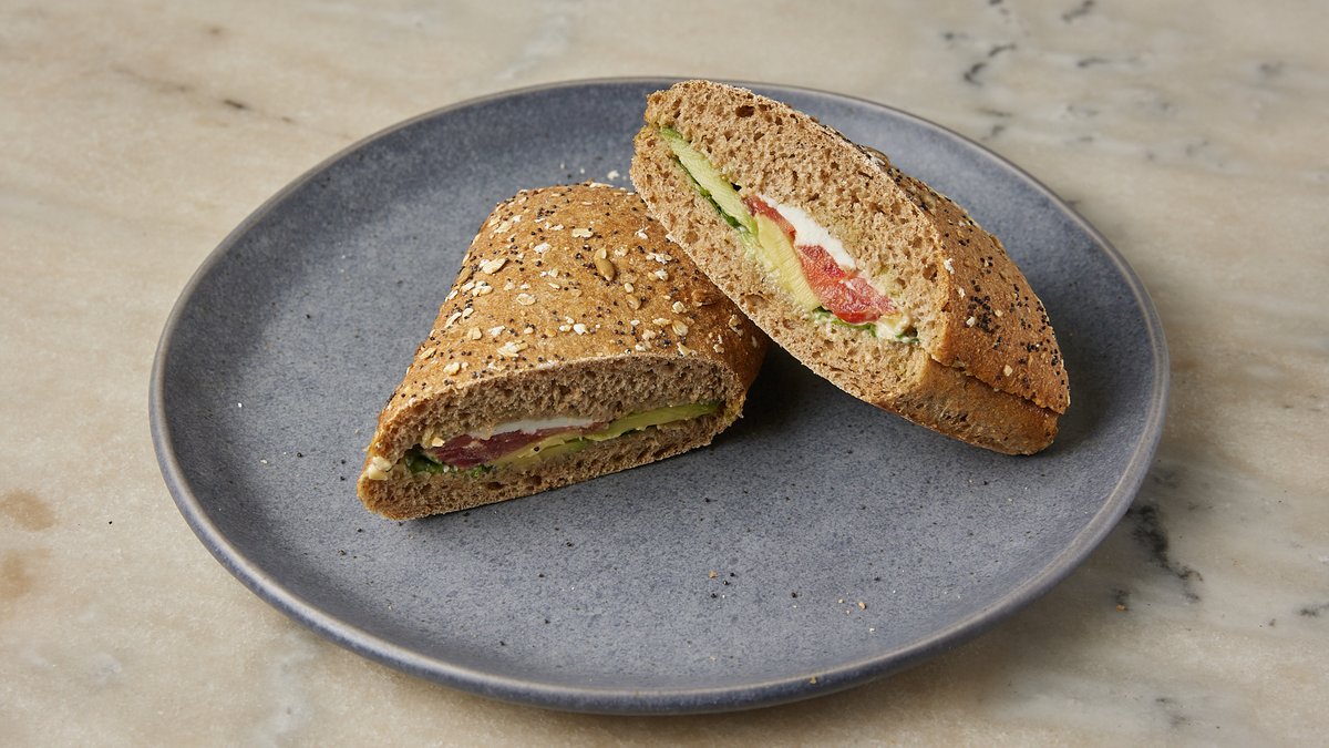 Προζυμένιο ψωμί σταρένιο, αυγό, μους αβοκάντο, ξύγαλο, ραπανάκι, μουστάρδα