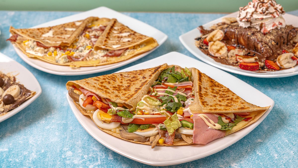 Αλμυρές κρέπες, γλυκές κρέπες, βάφλες, μερίδες, σαλάτες και χυμοί!