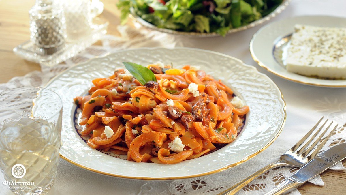 Χυλοπίτες χωριάτικες μαγειρεμένες με ντομάτα, κρεμμύδι, πιπεριά, φέτα και ελιές Καλαμών στο φούρνο