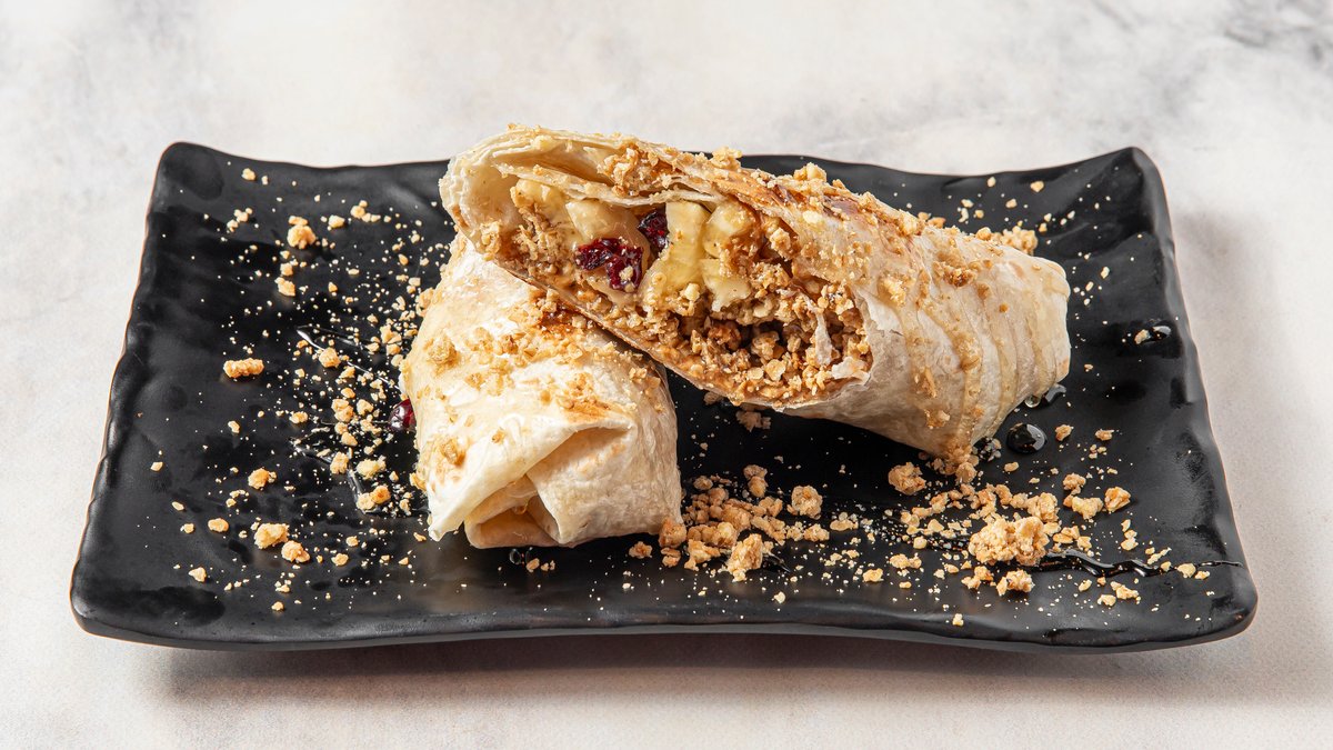 Tortillas με φυστικοβούτυρο, μπανάνα, granola, cranberries, μέλι και κανέλα