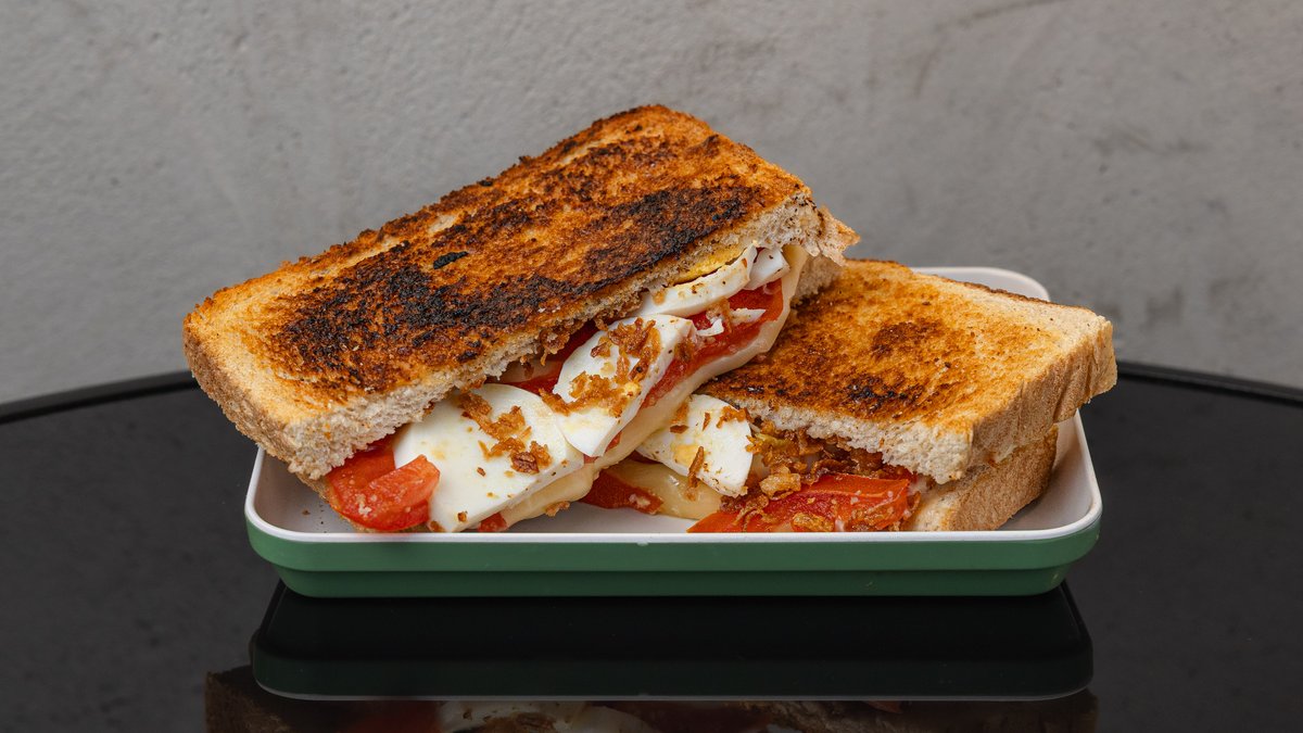 Brioche ψωμί του τοστ,αυγό βρασμένο, τυρί Gouda, ντομάτα, τηγανητό αποξ. κρεμμύδι, αλάτι, πιπέρι, κίτρινη σως (vegan mayo, mustard, αγαύης, αποξ.σχοινόπρασο)