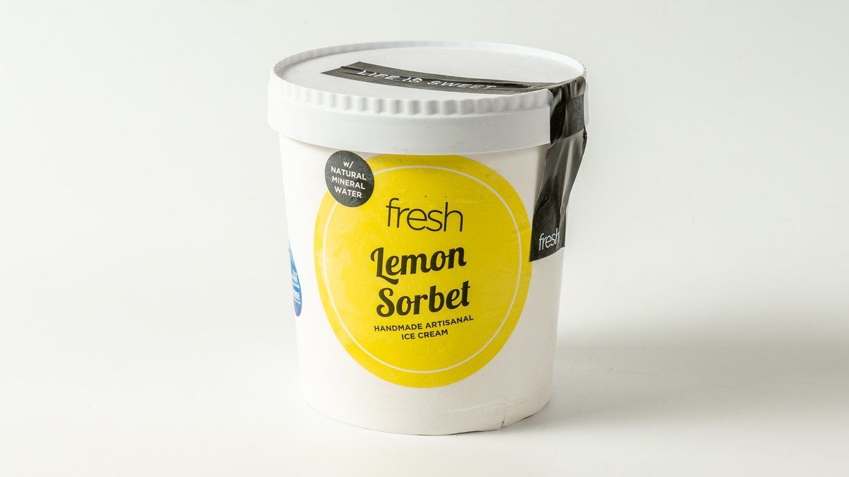 Χειροποίητο σορμπέ από λεμόνι φτιαγμένο από εμφιαλωμένο νερό. *Περιέχουν ίχνη από γάλα, αυγό, σόγια, γλουτένη και ξηρούς καρπούς. Για περισσότερες πληροφορίες, παρακαλούμε όπως επικοινωνήσετε μαζί μας.