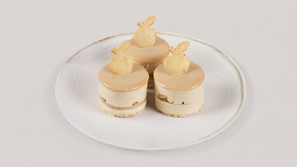 Καραμελωμένη μους λευκής σοκολάτας σε cremeux με αρώματα κανέλας και βανίλιας και εσωτερικά χειροποίητα καραμελωμένα μήλα σβησμένα με μηλίτη.