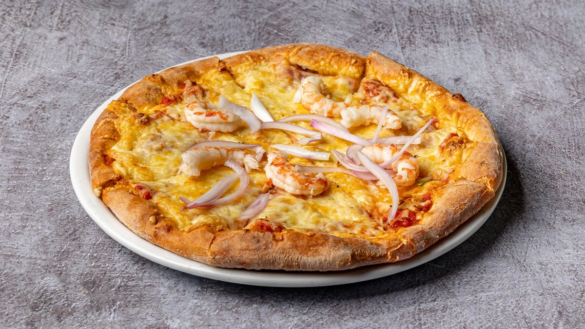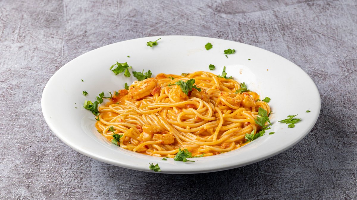 Με γαρίδες, κρέμα, καυτερό, κόκκινη πιπεριά και μπέικον. Συνοδεύεται από γαρνιτούρα της επιλογής σου