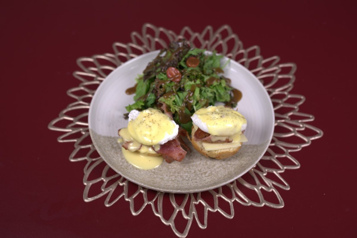 Με 2 ψωμάκια brioche, μπέικον, τυρί gouda και 2 αυγά ποσέ. Ολλανδέζ και mix σαλάτας.