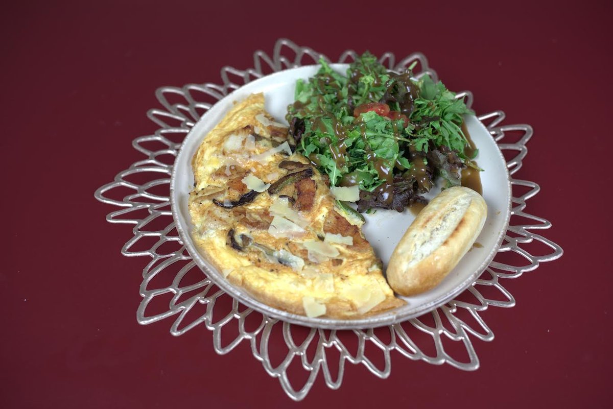 3 αυγά, κοτόπουλο, μανιτάρια, πιπεριά, παρμεζάνα, Συνοδεύεται με mix σαλάτας και mini ψωμάκι.
