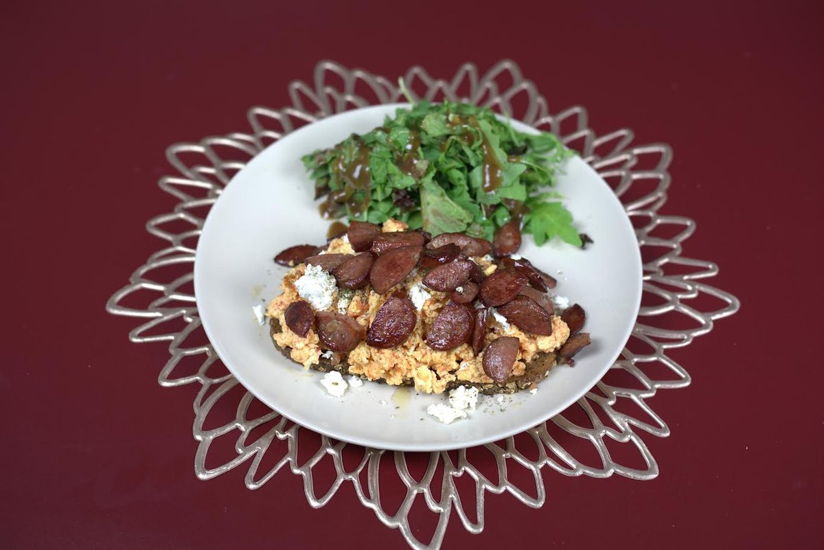 Πάνω σε φρυγανισμένο ψωμάκι, γουακαμόλε, ομελέτα με ασπράδια, μανιτάρια, συνοδεύεται με mix σαλάτας
