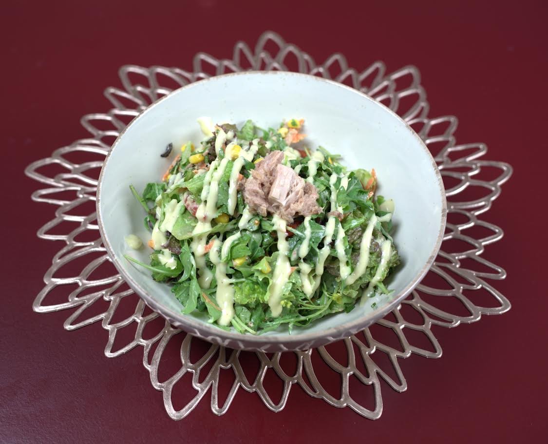 Καπνιστός τόνος, καλαμπόκι, καρότο, άνηθο, κρεμμύδι φρέσκο, ντοματίνια, sauce αντζούγιας και mix σαλάτας