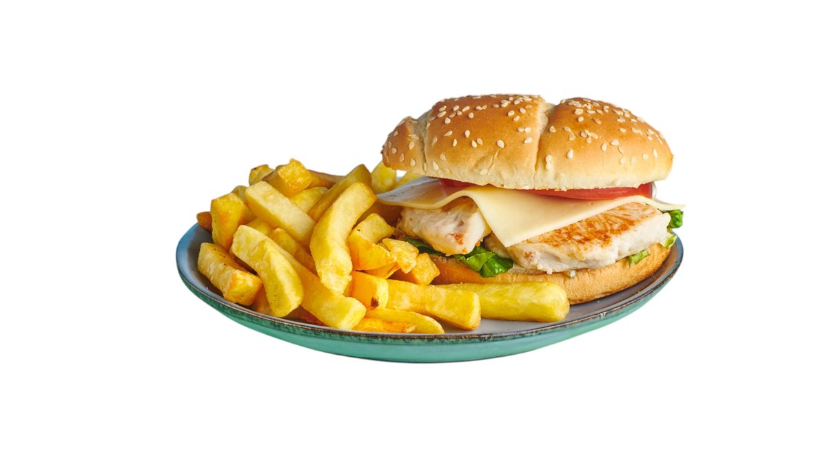 150 g κοτόπουλο ψητό, ντομάτα, τυρί κρέμα, μαρούλι, ντομάτα, μπέικον και πατάτες country