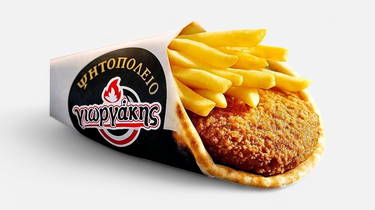 Συνοδεύεται από ντομάτα, κρεμμύδι, πατάτες τηγανητές, sauce Γιωργάκης και 1 πίτα