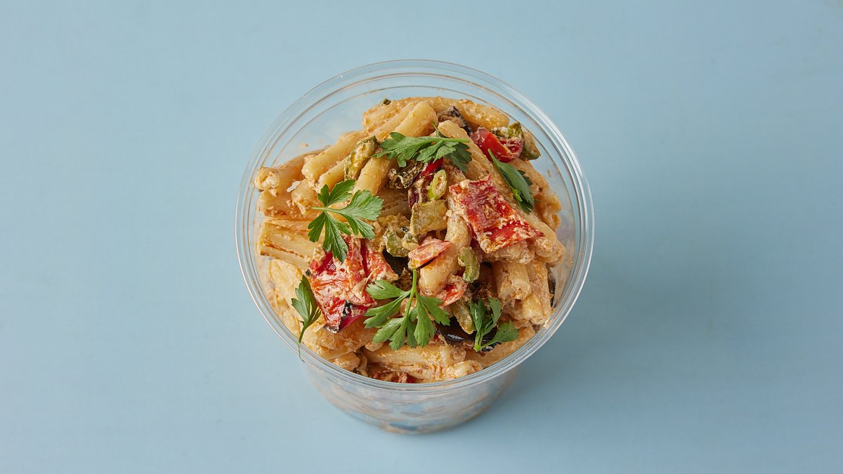 Μακαρονοσαλάτα, ψητά λαχανικά, pesto λιαστής ντομάτας, γιαούρτι, μυρωδικά