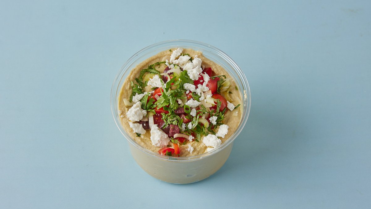 Φάβα, ψητά ρεβίθια, ελιές, κρεμμύδι, ντοματίνια, τριμμένη φέτα, κόλιανδρος, λαδόπιτες