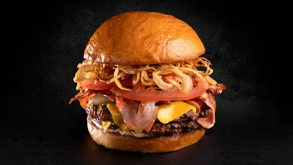 Αφράτο ψωμάκι brioche με 2 μπιφτέκια από 100% μοσχαρίσιο κιμά, 4 φέτες μπέικον, 4 φέτες cheddar, τηγανητά chips κρεμμυδιού, ντομάτα, πίκλες αγγουριού, aioli sauce και bbq sauce