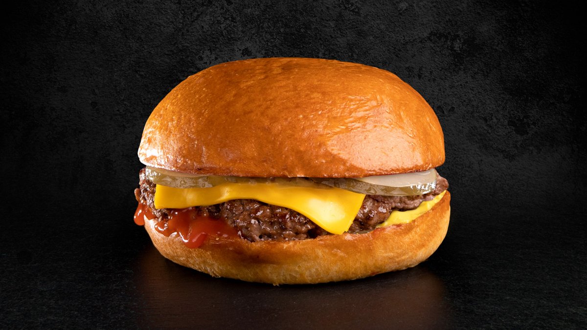 Αφράτο ψωμάκι brioche με μπιφτέκι από 100% μοσχαρίσιο κιμά, cheddar, ketchup, μουστάρδα και πίκλα αγγουριού