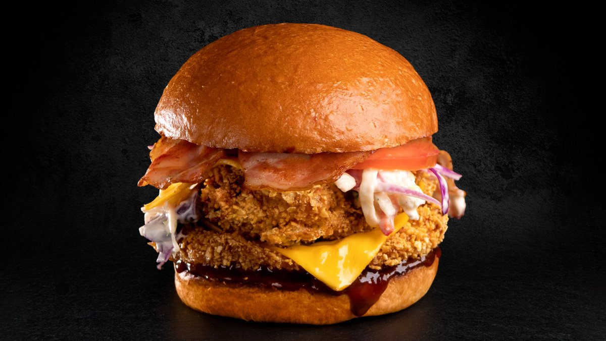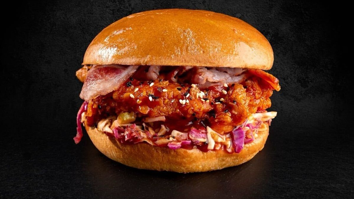 Spicy. Αφράτο ψωμάκι brioche με 2 τεμάχια στήθος κοτόπουλο μαριναρισμένο σε buttermilk, 2 φέτες cheddar, λάχανο coleslaw, ντομάτα, μπέικον ,χειροποίητη secret sauce και χειροποίητη BBQ sauce