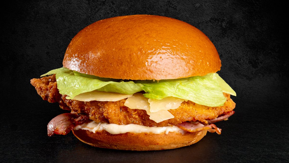 Αφράτο ψωμάκι brioche με φιλέτο στήθος κοτόπουλο, flakes παρμεζάνας, μπέικον, μαρούλι και σάλτσα παρμεζάνα