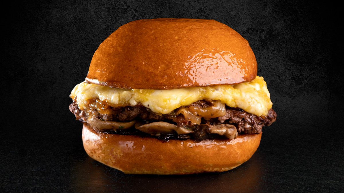 Αφράτο ψωμάκι brioche με μπιφτέκι από 100% μοσχαρίσιο κιμά, μανιτάρια σωτέ, λιωμένο τυρί προβολόνε, καραμελωμένα κρεμμύδια, κρόκο αυγού αργής ωρίμανσης και χειροποίητη Aioli sauce