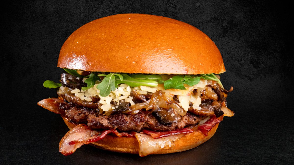 Αφράτο ψωμάκι brioche με μπιφτέκι προβατίνας, κατσικίσιο τυρί, μανιτάρια, καραμελωμένο κρεμμύδι, ρόκα και cheddar sauce