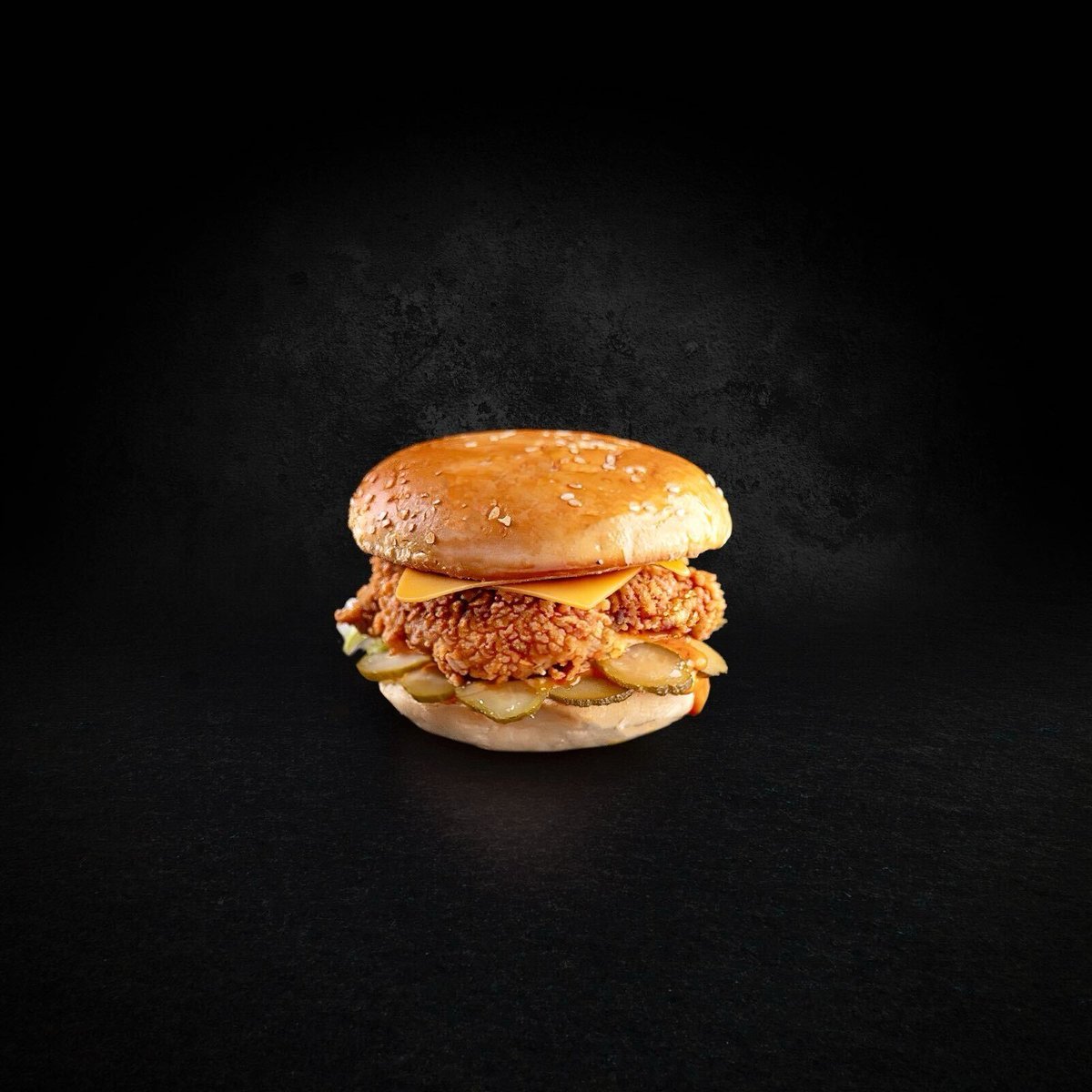 Αφράτο ψωμάκι brioche, φιλέτο στήθος κοτόπουλο βουτηγμένο σε ελαφρώς πικάντικη κόκκινη σάλτσα, 2 φέτες μπέικον και ψητά λαχανικά. Πασπαλισμένο με λευκό και μαύρο σουσάμι