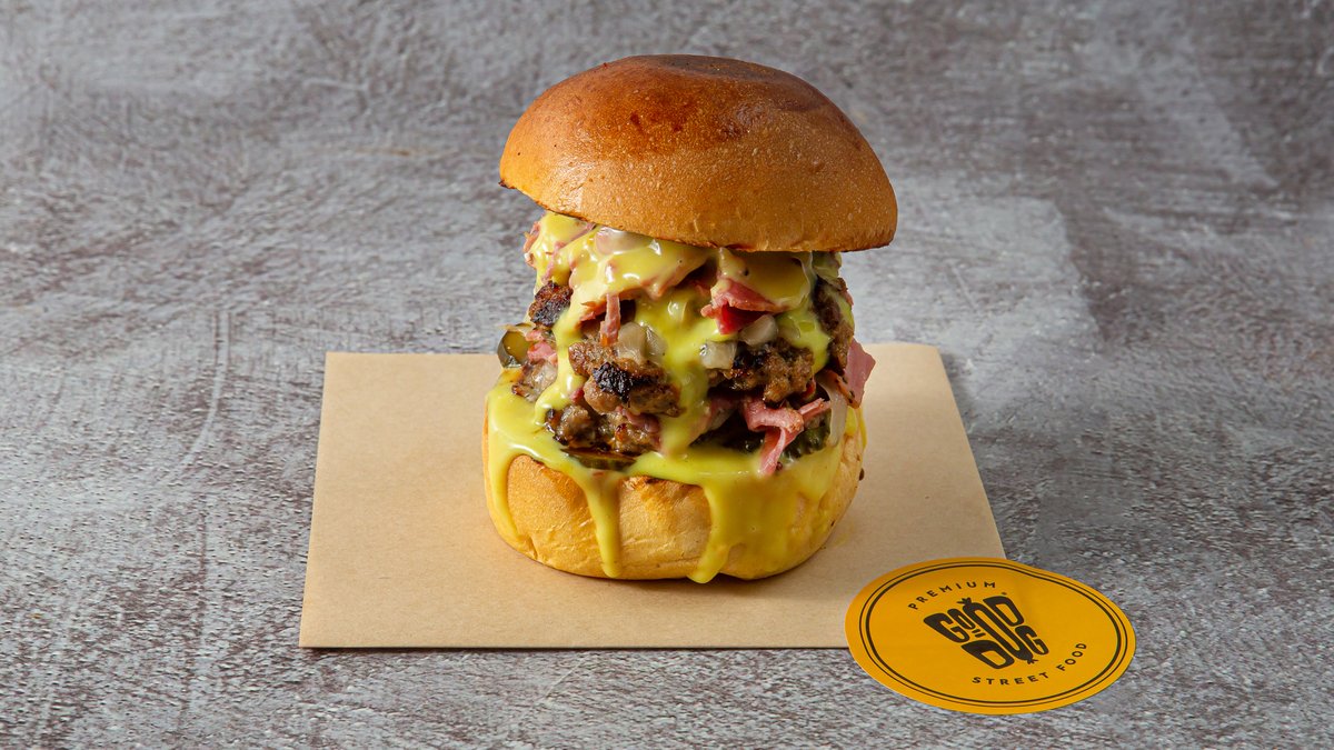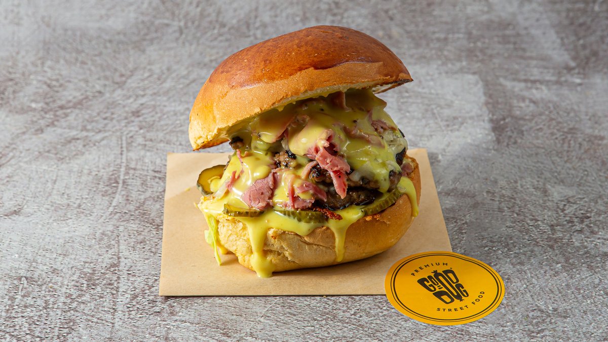 Με 2 smashed μπιφτέκια, φέτες παστράμι, γραβιέρα Αμφιλοχίας, πίκλες και honey mustard