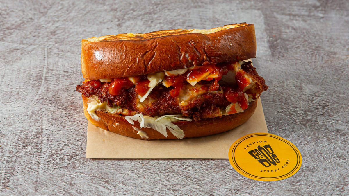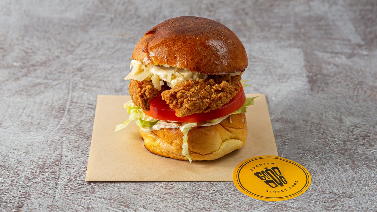 Ψωμάκι brioche με τηγανητό κοτόπουλο φιλέτο πανέ, cheddar, coleslaw, μαγιονέζα τρούφας, sweet pickle relish και roasted onion sauce