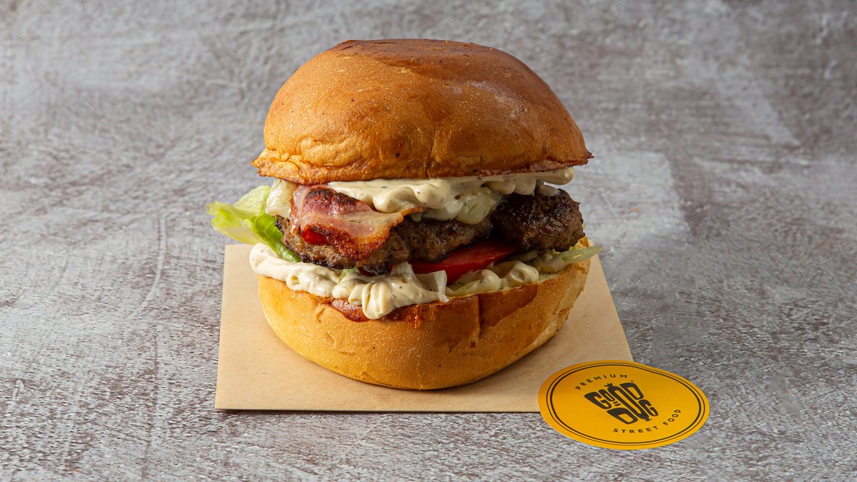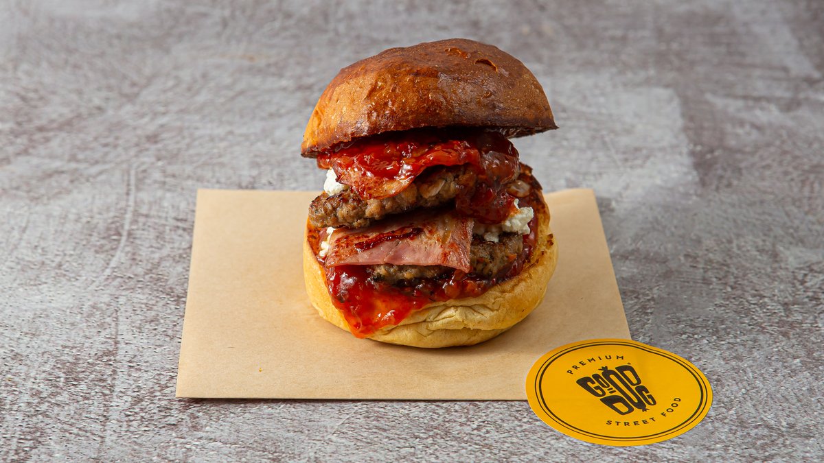 Με 2 smashed μπιφτέκια, κατσικίσιο τυρί, μαρμελάδα ντομάτας, iceberg, μαγιονέζα τρούφας και crispy bacon