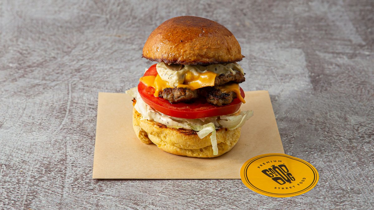 Με 2 smashed μπιφτέκια 180g, διπλό cheddar, pickle sauce, ketchup και μουστάρδα