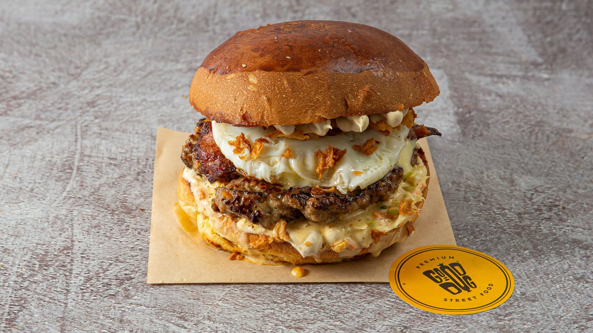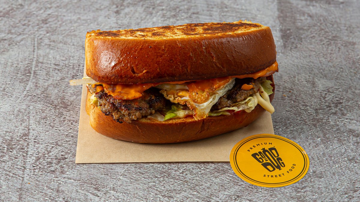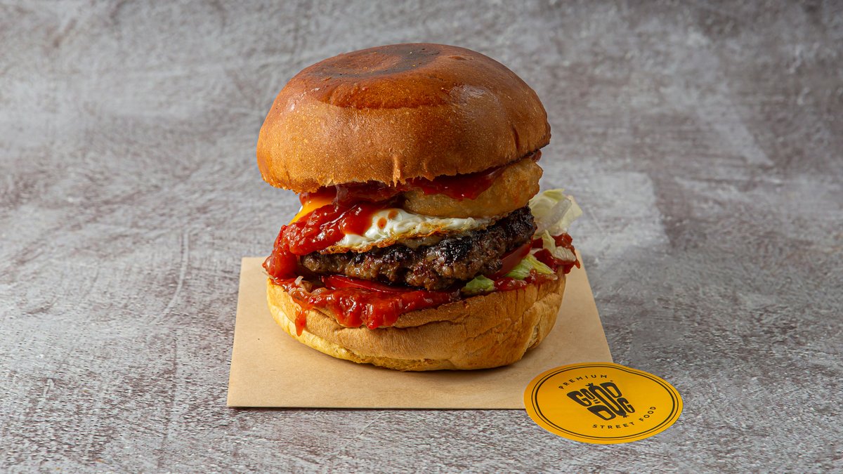 Με μπιφτέκι από 100% μοσχαρίσιο κιμά 180g, Monterey Jack cheese, αυγό τηγανητό, onion rings, ντομάτα, iceberg και καυτερή Good Boy spicy sauce