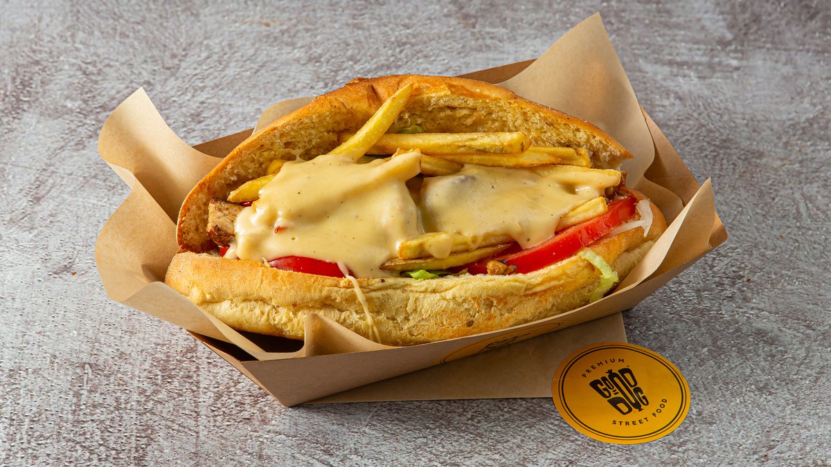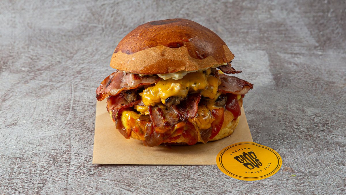 Με μπιφτέκι από 100% μοσχαρίσιο κιμά 180g, ντομάτα, iceberg, wholegrain sauce, bacon, cheddar, τηγανητό παναρισμένο λουκάνικο και επικάλυψη cheddar sauce σε όλο το burger