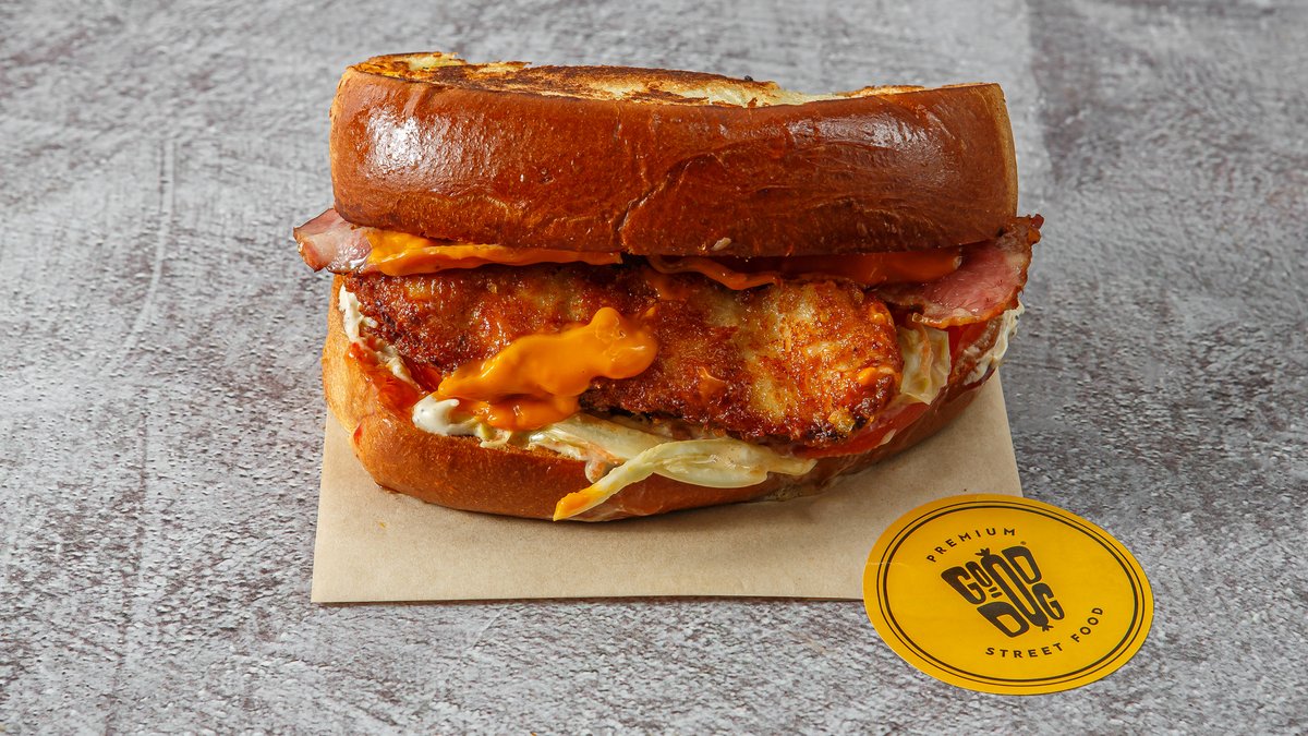 Brioche bun με παναρισμένο κοτόπουλο, μπέικον, cheddar, τηγανητές πατάτες, κίτρινη ketchup, μαγιονέζα και iceberg