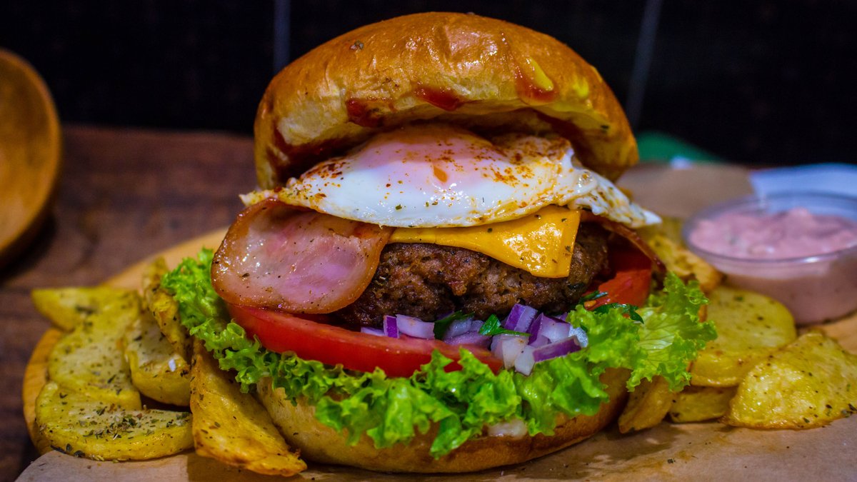 Με διπλό μπιφτέκι μοσχαρίσιο, μπέικον, ντομάτα, κρεμμύδι, μαρούλι, cheddar, ketchup, μουστάρδα και μαγιονέζα. Συνοδεύεται από πατάτες τηγανητές και σως cocktail