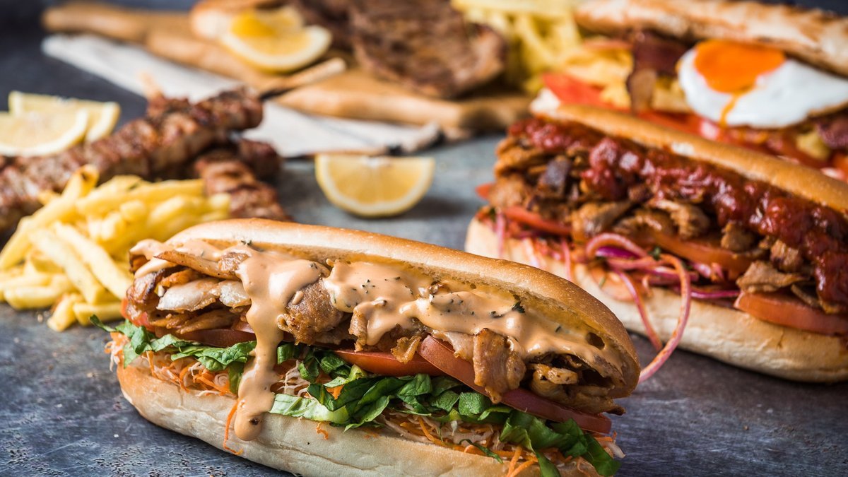 Ψωμί ψητό στη σχάρα, κεμπάπ, κρεμμύδια με μαϊντανό, φρέσκιες τηγανητές πατάτες, σάλτσα γιαουρτιού, πιπέρι καγιέν, καπνιστή πάπρικα