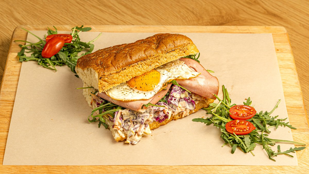Με 2 φέτες φρυγανισμένο καρβέλι, gouda, ζαμπόν, cheddar, μπεσαμέλ και αυγό τηγανητό. Συνοδεύεται από πατάτες τηγανητές